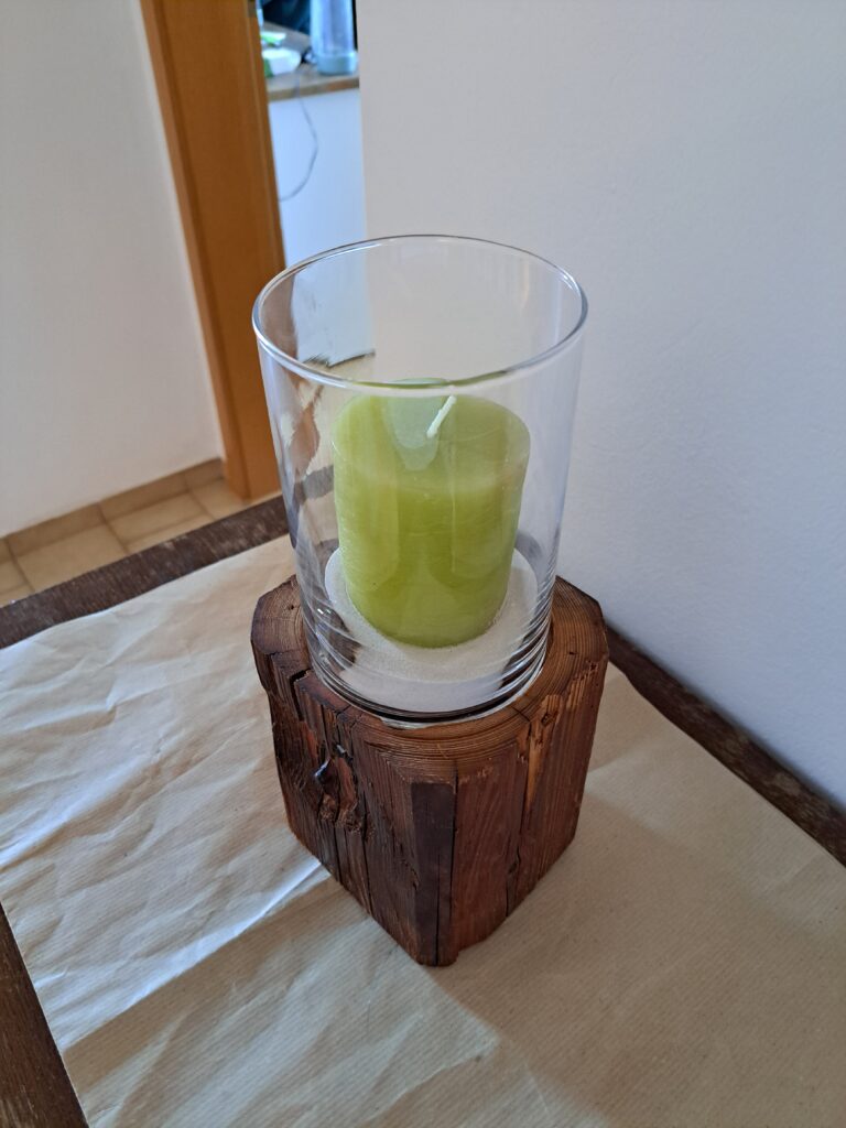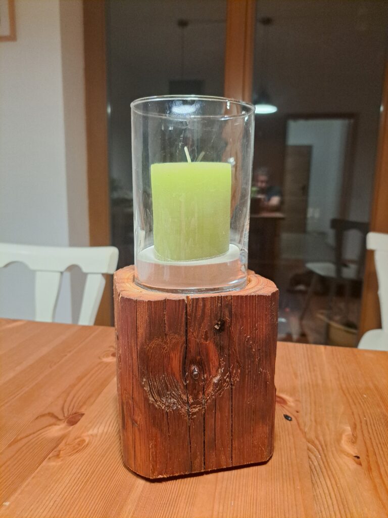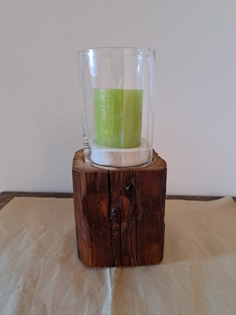 Der Kerzenständer ist aus einem alten Dachstuhlbalken aus Kiefer gefertigt.