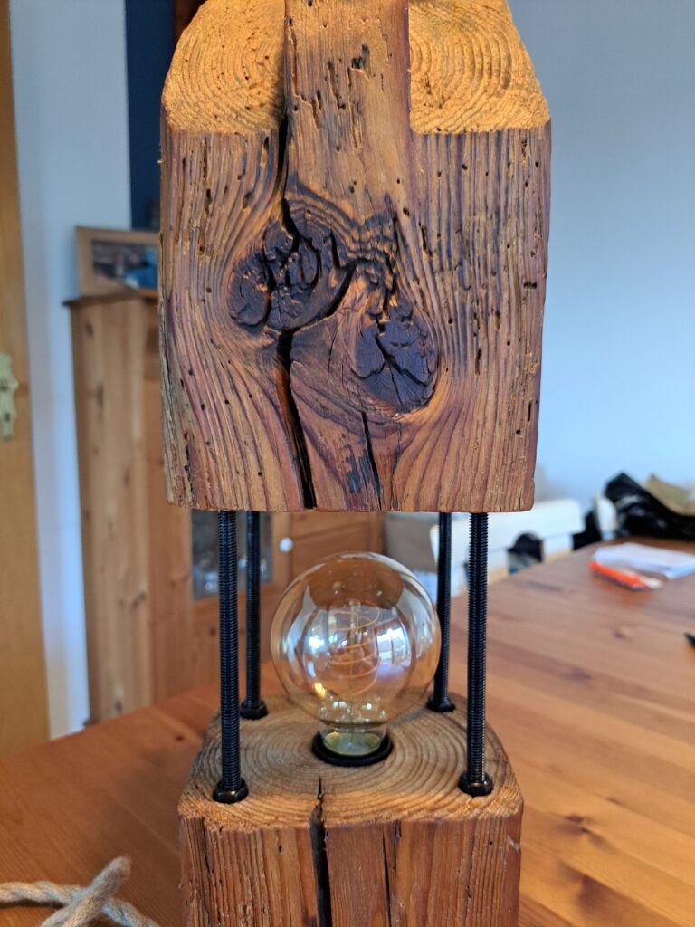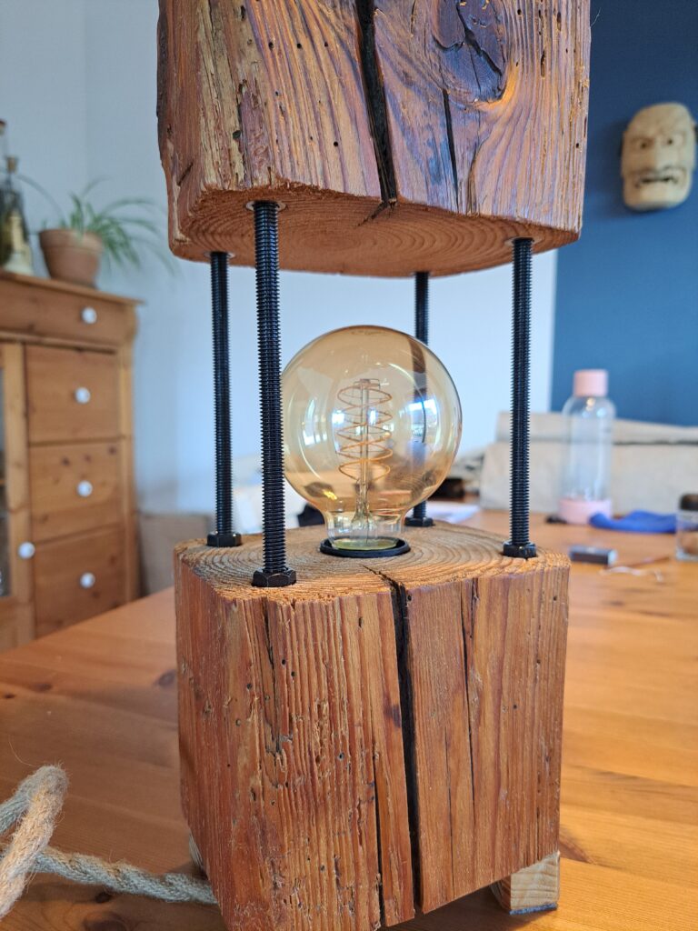 Die Tischleuchte ist aus einem alten Dachstuhlbalken aus Kiefer gefertigt. Die Edison LED-Glühbirne ist dimmbar.