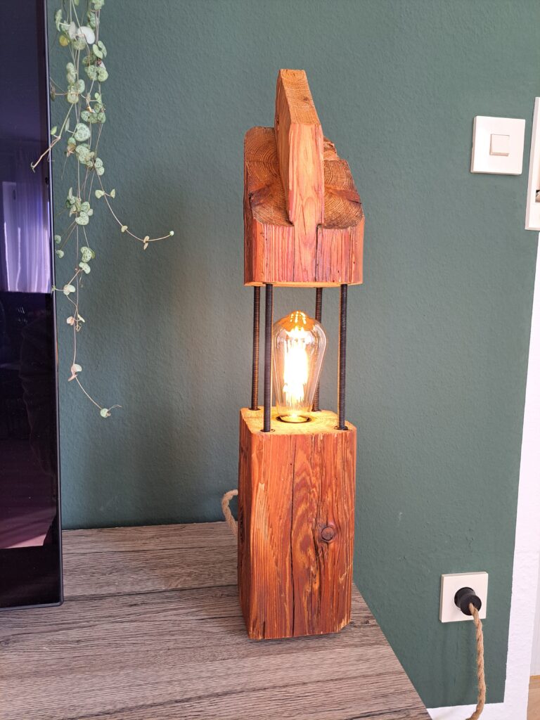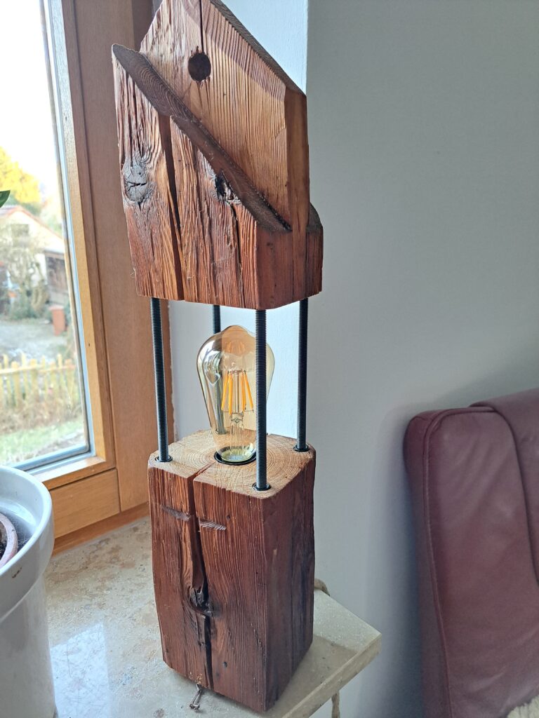 Die Tischlampe ist aus einem alten Dachstuhlbalken aus Kiefer gefertigt. Die Edison LED-Glühbirne ist dimmbar.