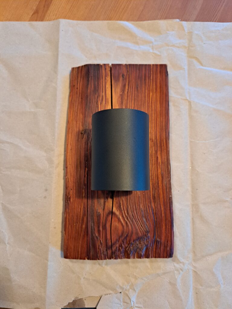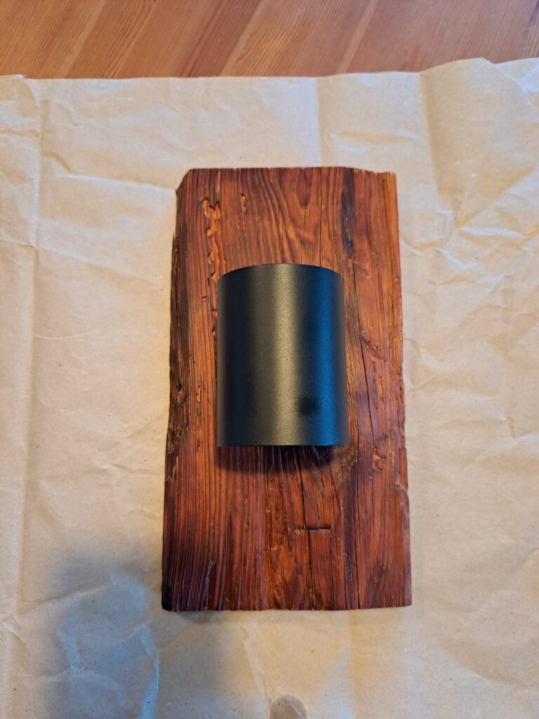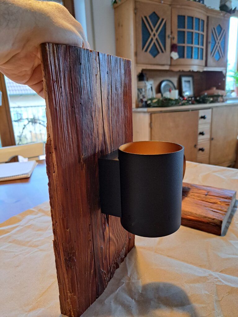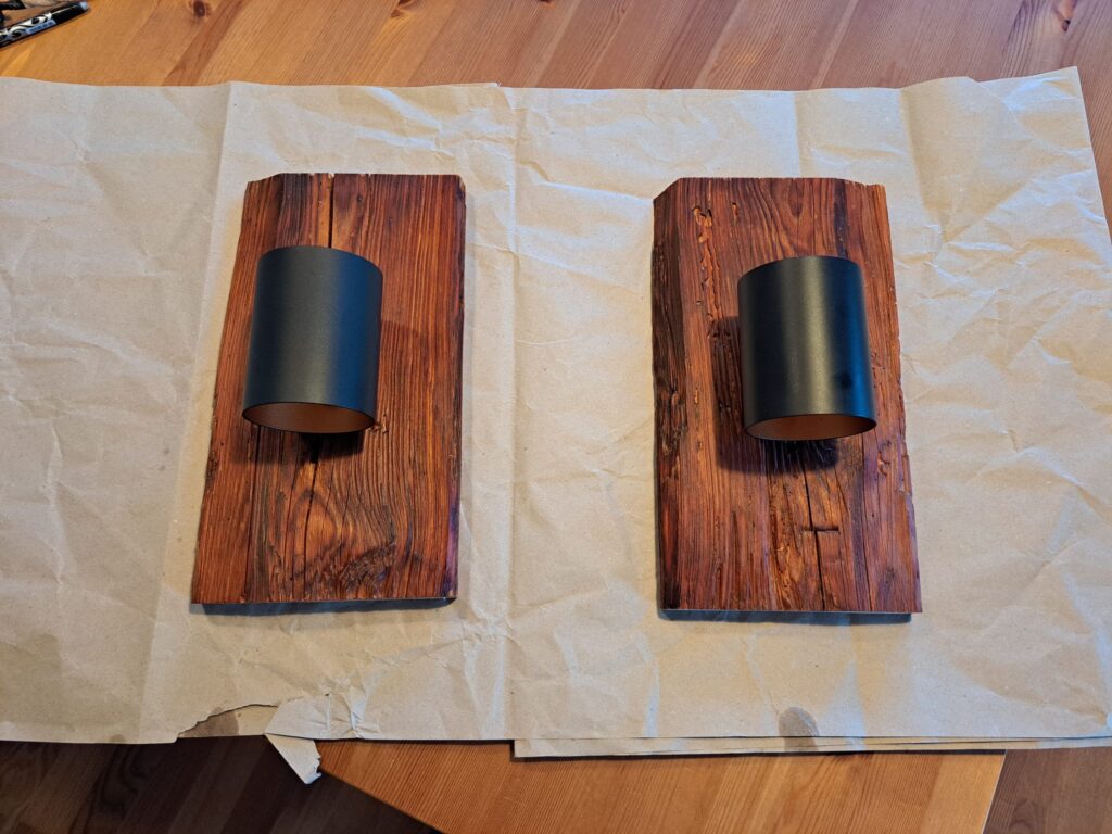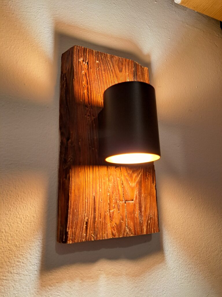 Diese zwei Wandleuchten wurden aus aufgetrennten Teilen eines massiven alten Dachstuhlbalkens aus Kiefer gefertigt. Verbaut wurden G9 Wandleuchten.