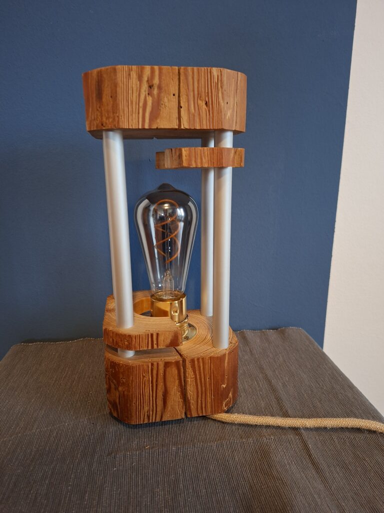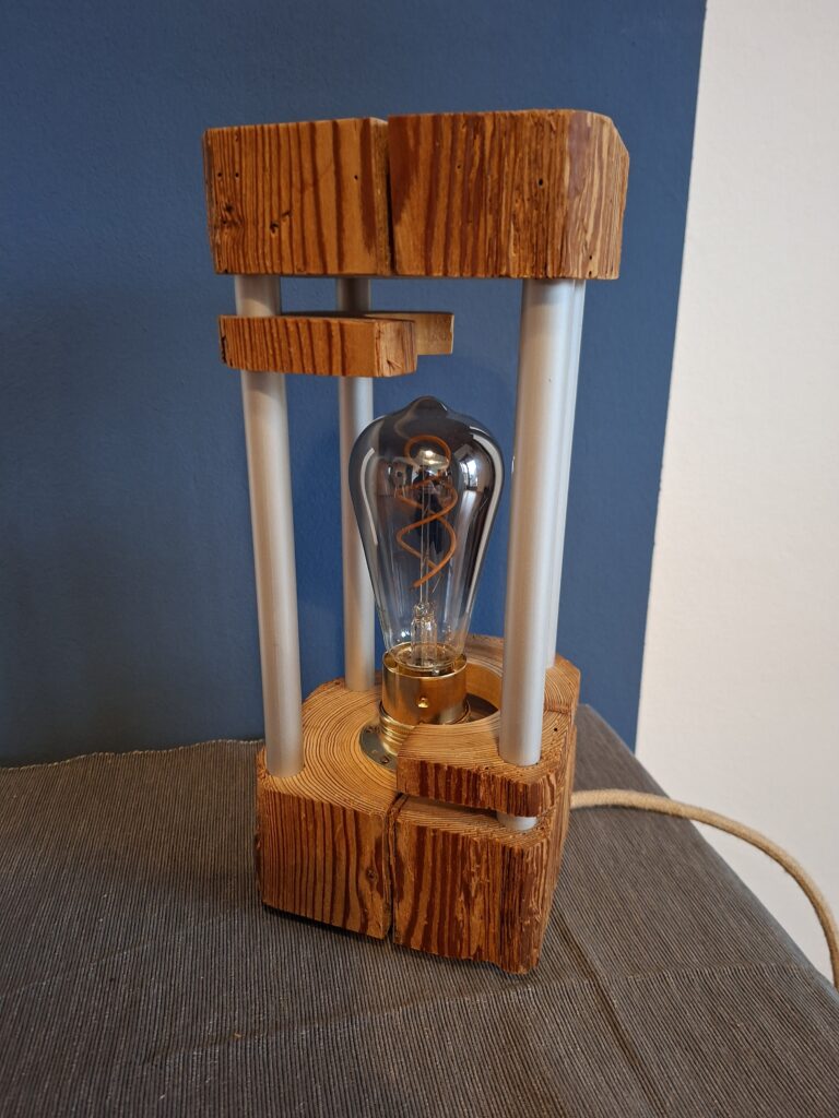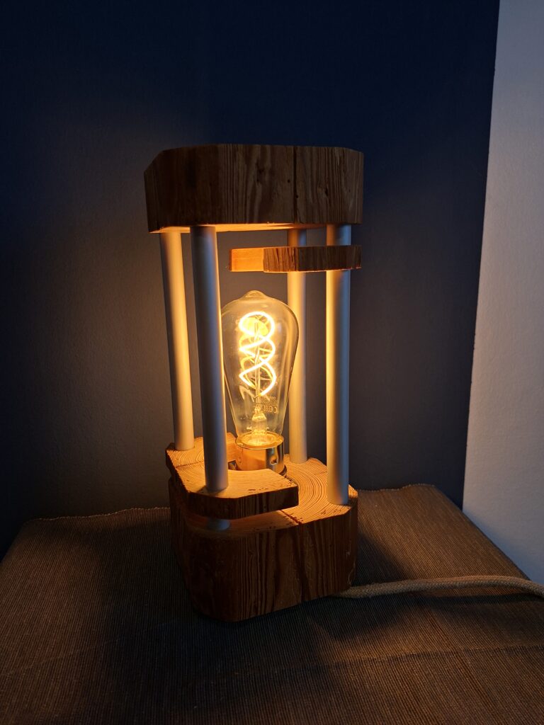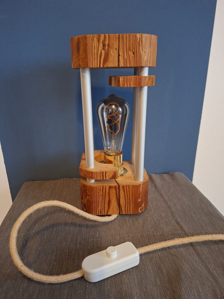 Wollte mal eine weniger rustikal anmutende Version bauen. Dicke Aluminium-Streben, eine erhöhte Messing-Fassung und zur Abwechslung mal weiße Schalter und Stecker.