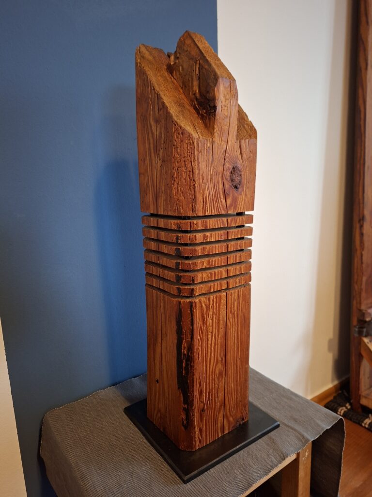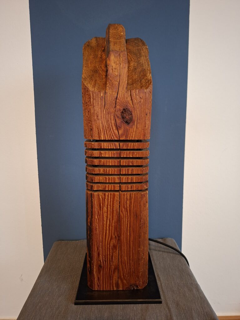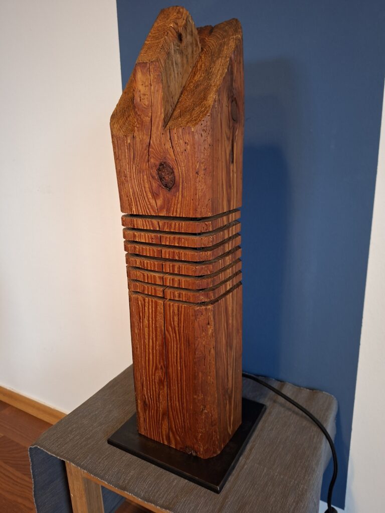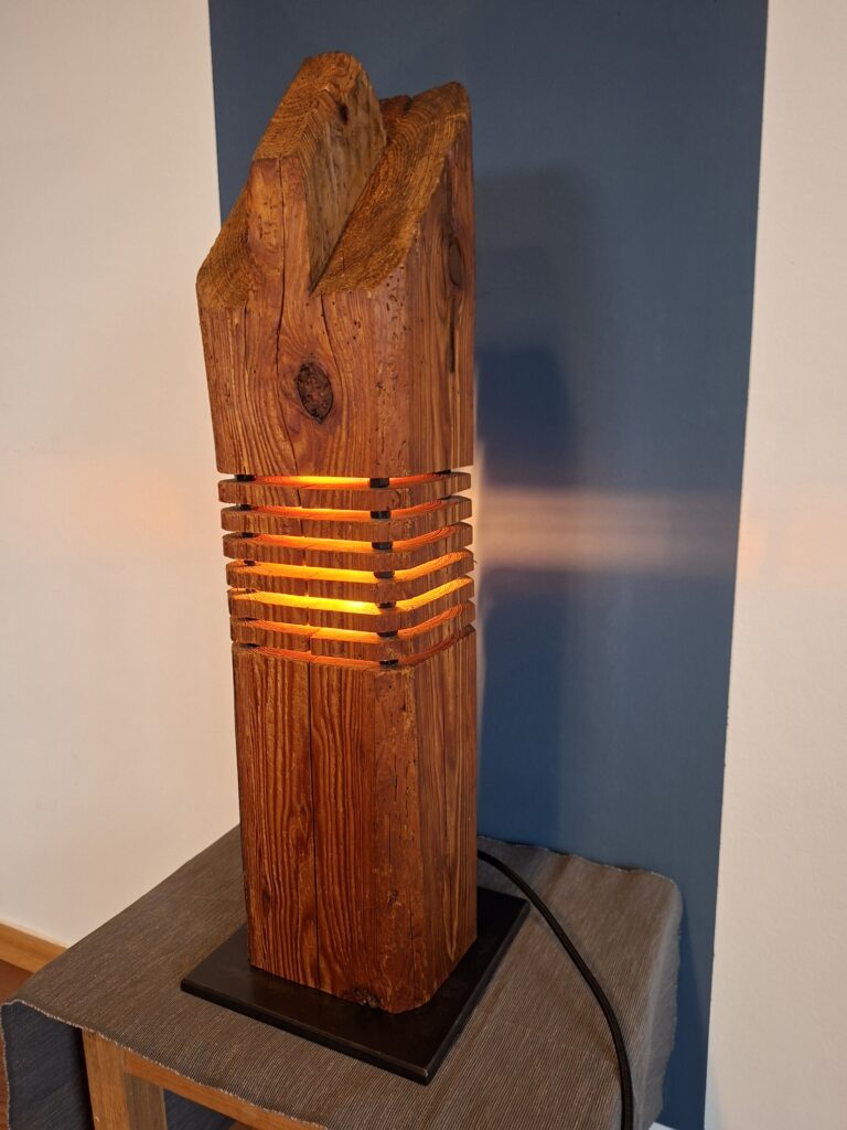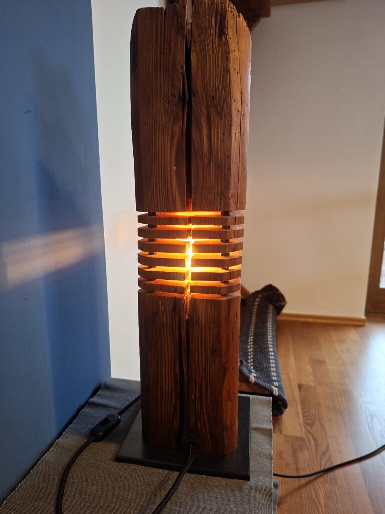 In gewisser weiße eine Kombination aus meinen bisherigen Etagenleuchten und Strebenleuchten. Altholz-Balken mit sichtbarem Zapfen auf einem brünierten Stahl-Sockel.