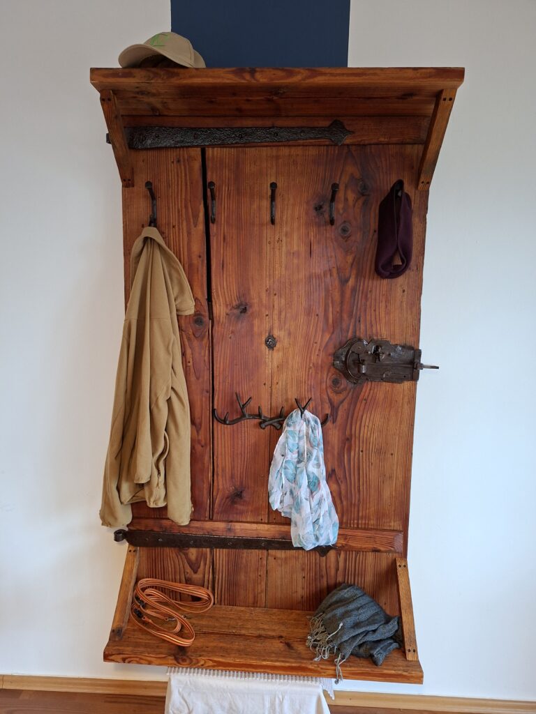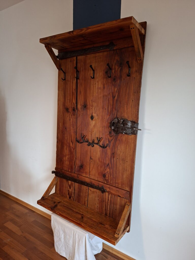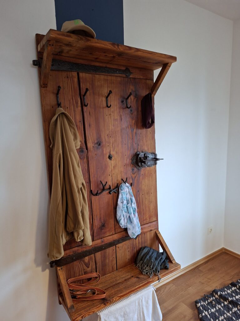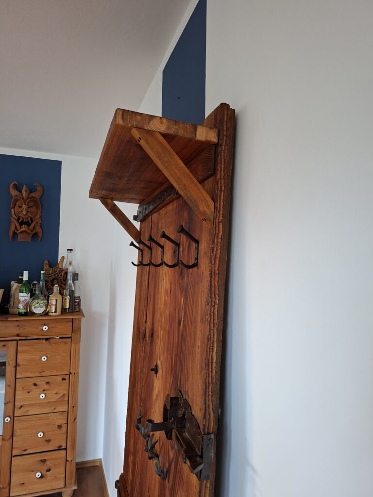 Rustikale Garderobe aus einer sehr alten Holztür gefertigt. Die Beschläge und das Altholz wurden aufgearbeitet. Eine Hutablage sowie eine weitere unten aus Altholz-Bretten sorgen zusammen mit den Haken für ausreichend Platz.
