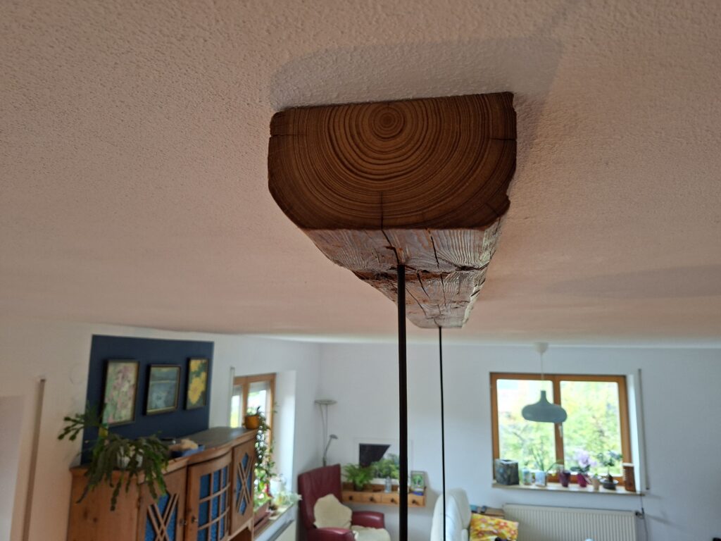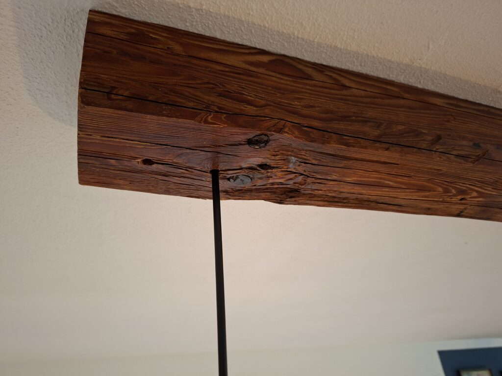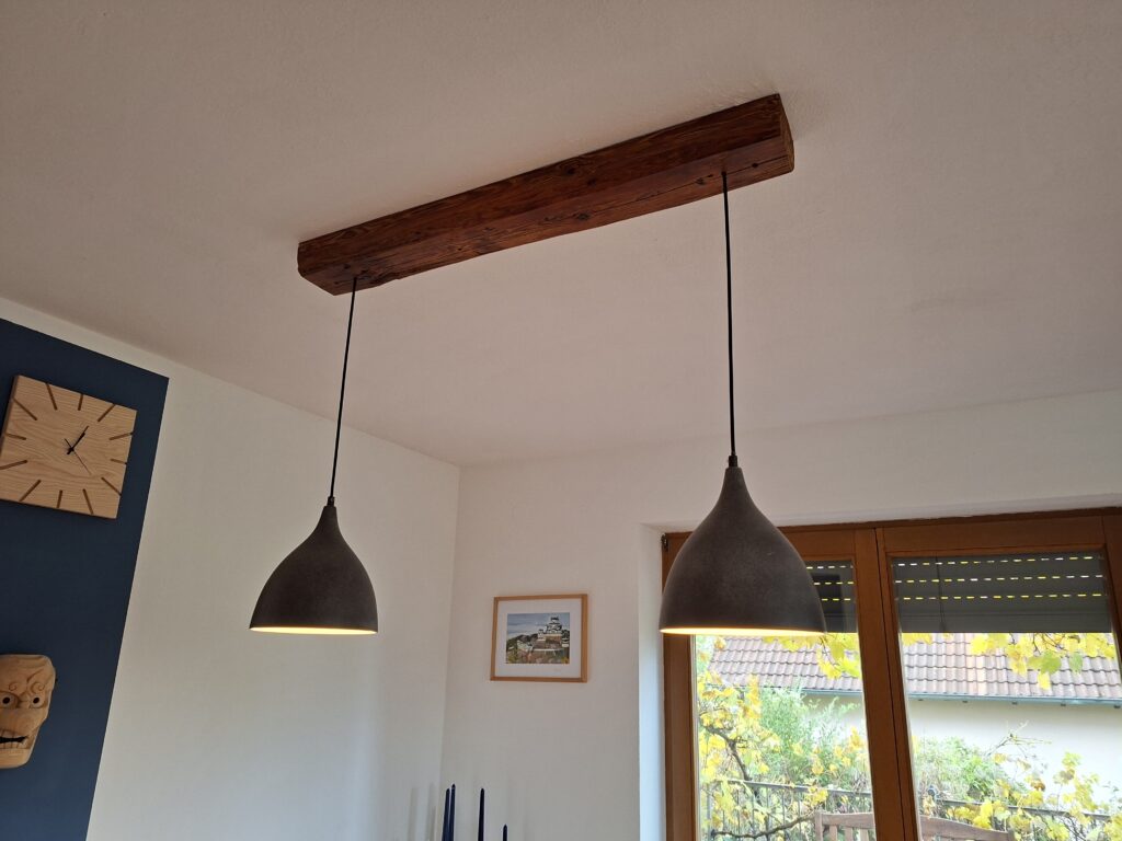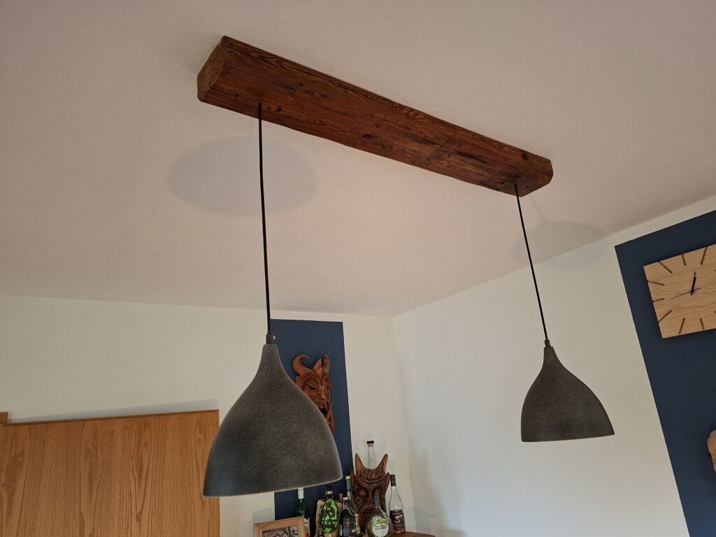 Ein kleines Upcycling-Projekt. Die beiden Hängeleuchten, gebraucht besorgt, waren noch gut in Schuss. Durch einen längs aufgetrennten Altholzbalken wurden Sie zu einer Pendelleuchte über dem Esstisch.