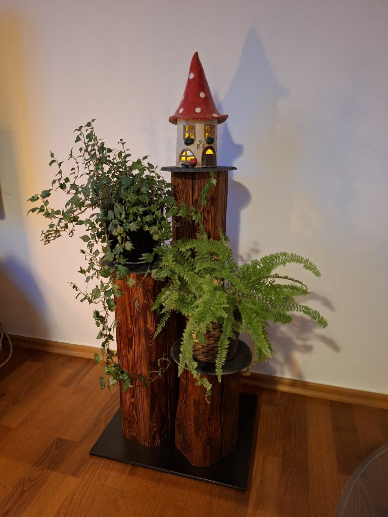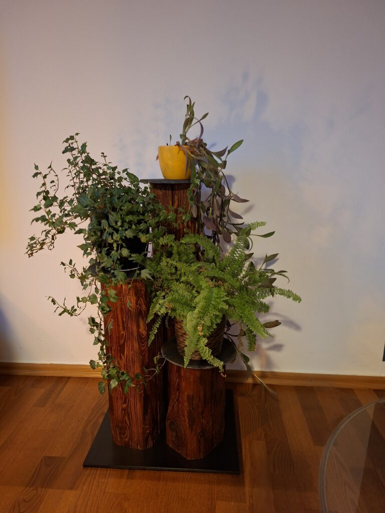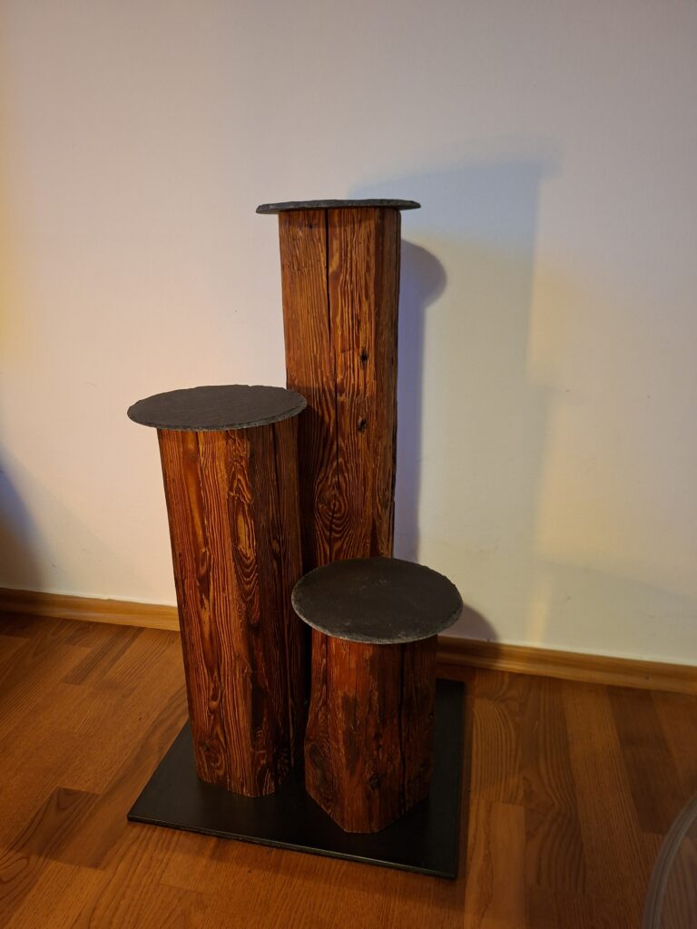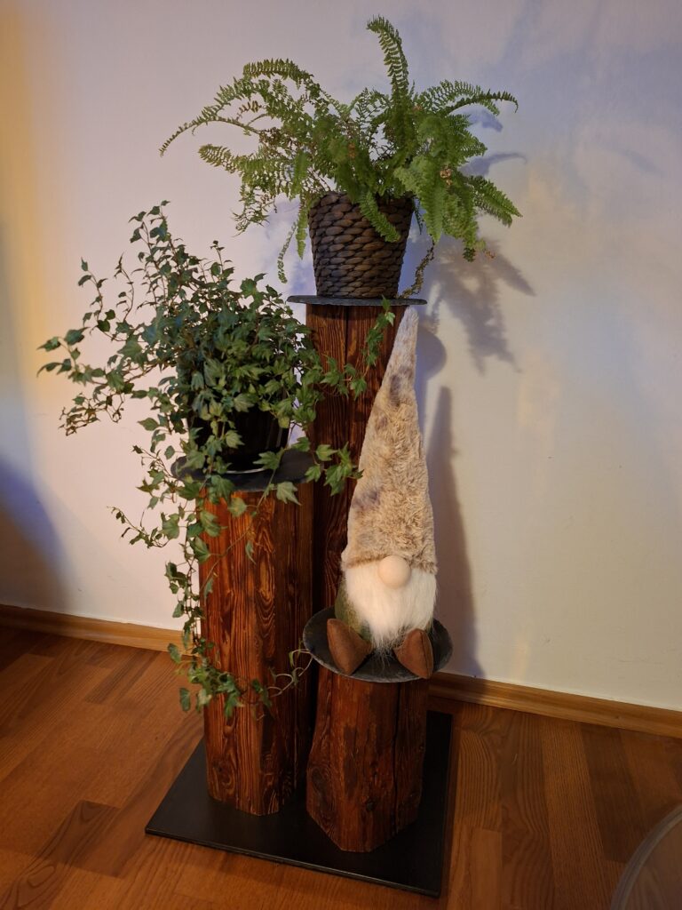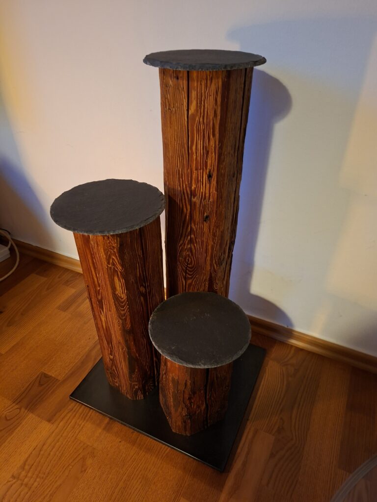 Altholz-Balken auf einer Stahlplatte befestigt. Schieferplatten dienen als Auflage für Pflanzen oder Deko.